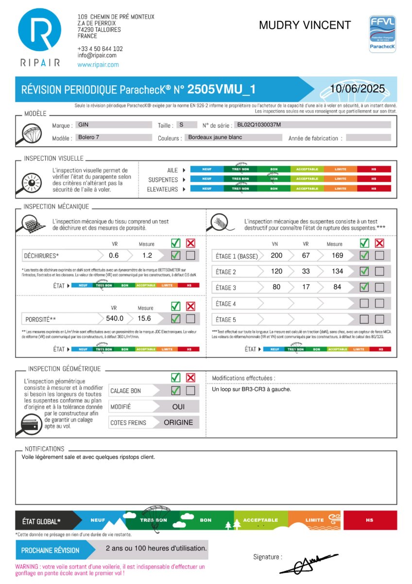 Une révision périodique PARACHECK© a été effectuée, ce qui signifie que la totalité de l’aile a été contrôlée.