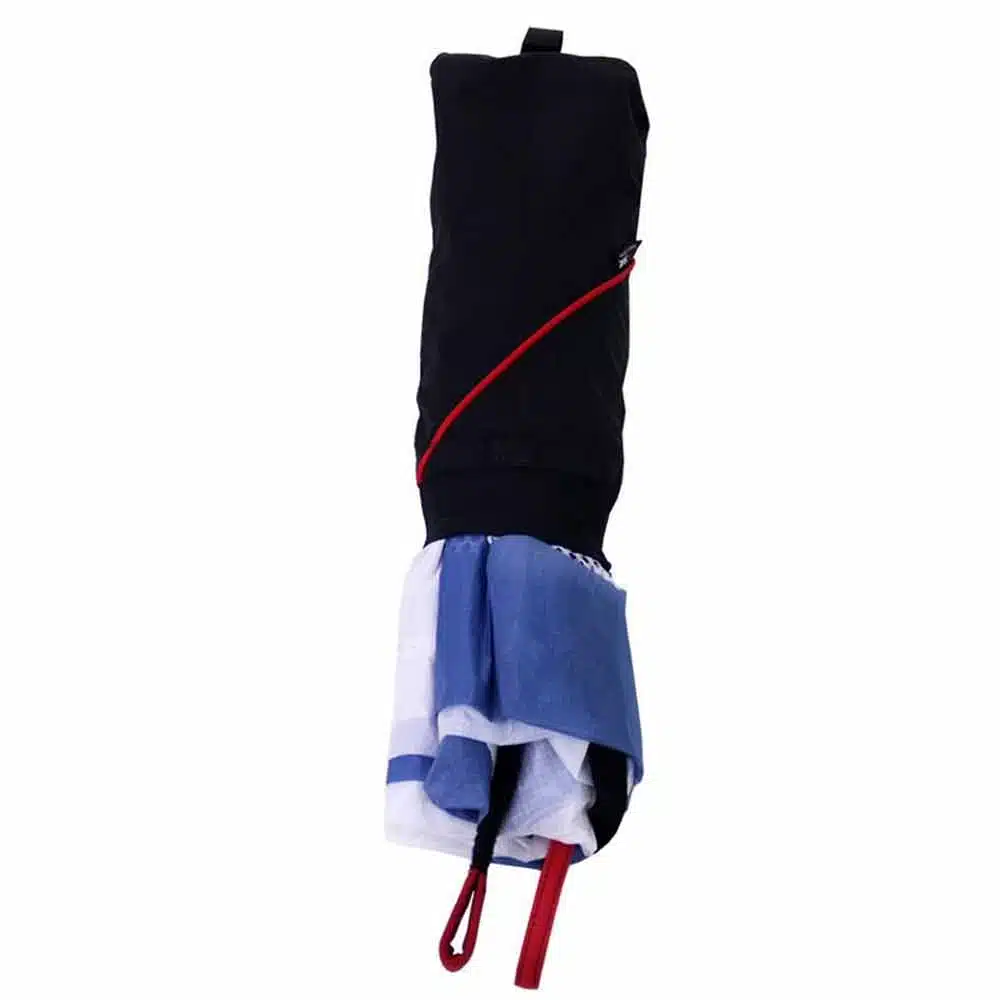 Il est plié dans une petite pochette qui s’adapte à n’importe quel harnais et peut être utilisé sans la pochette si le harnais a un compartiment anti-G dédié.