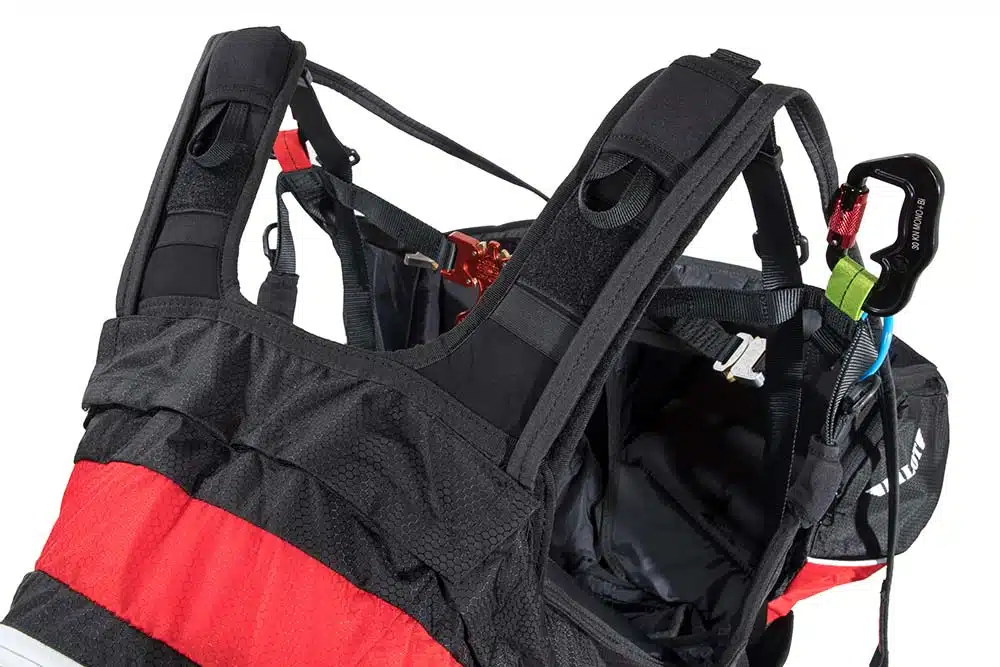 En ce qui concerne le parachute de secours, il est intégré en position centrale dans le dos. Un canal gauche et droite permet de faire passer l’élévateur de secours Y sur la sangle d’épaule vers l’écarteur de biplace.