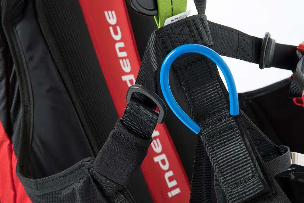 La poche de secours de cette sellette est optimisée pour accueillir n’importe quel type de secours biplace.